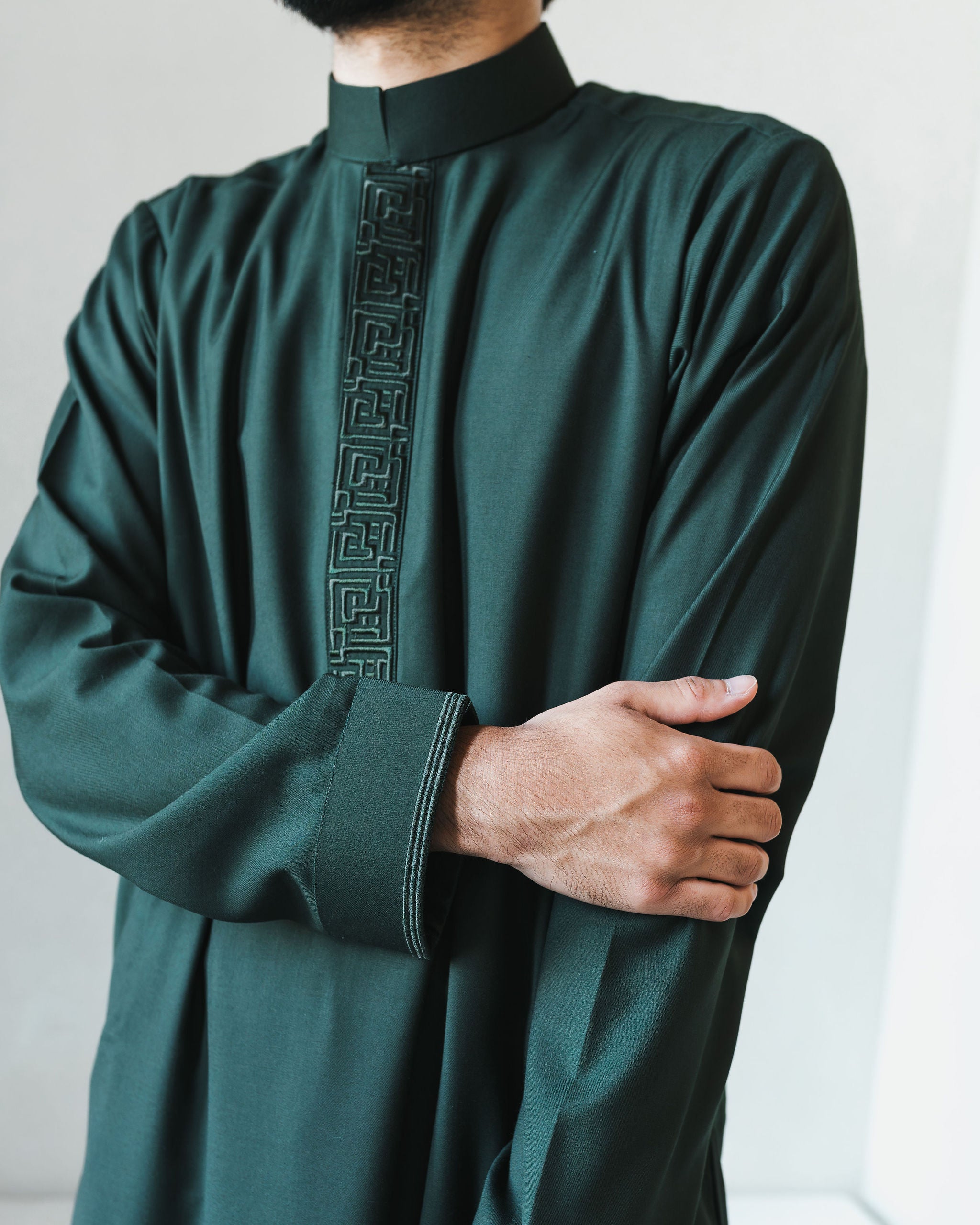 Elevate your wardrobe with our Men's Forest Green Signature Thobe, featuring an elegant twist on traditional style. The aaBideen signature embroidery on the placket adds a unique touch to this must-have piece.