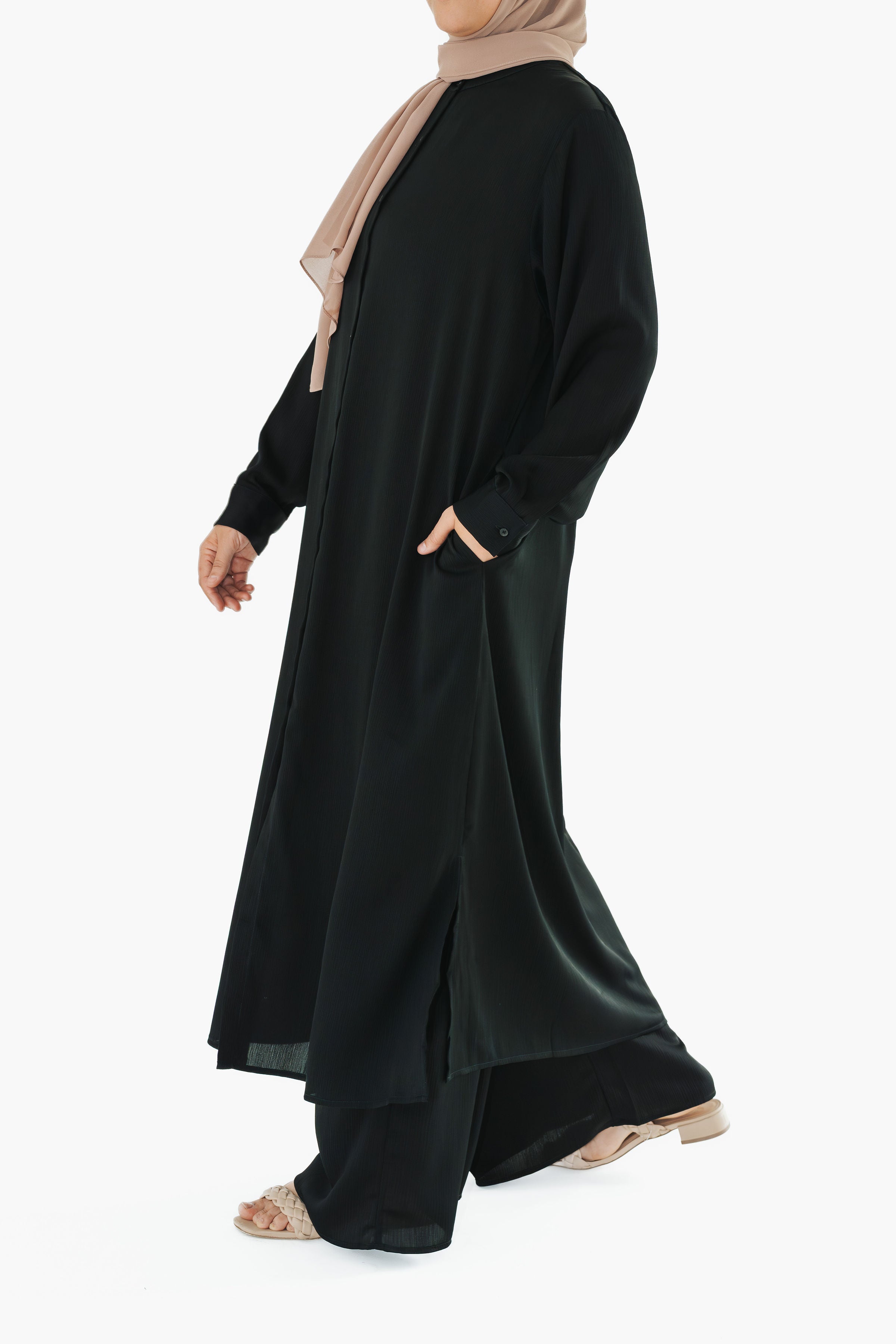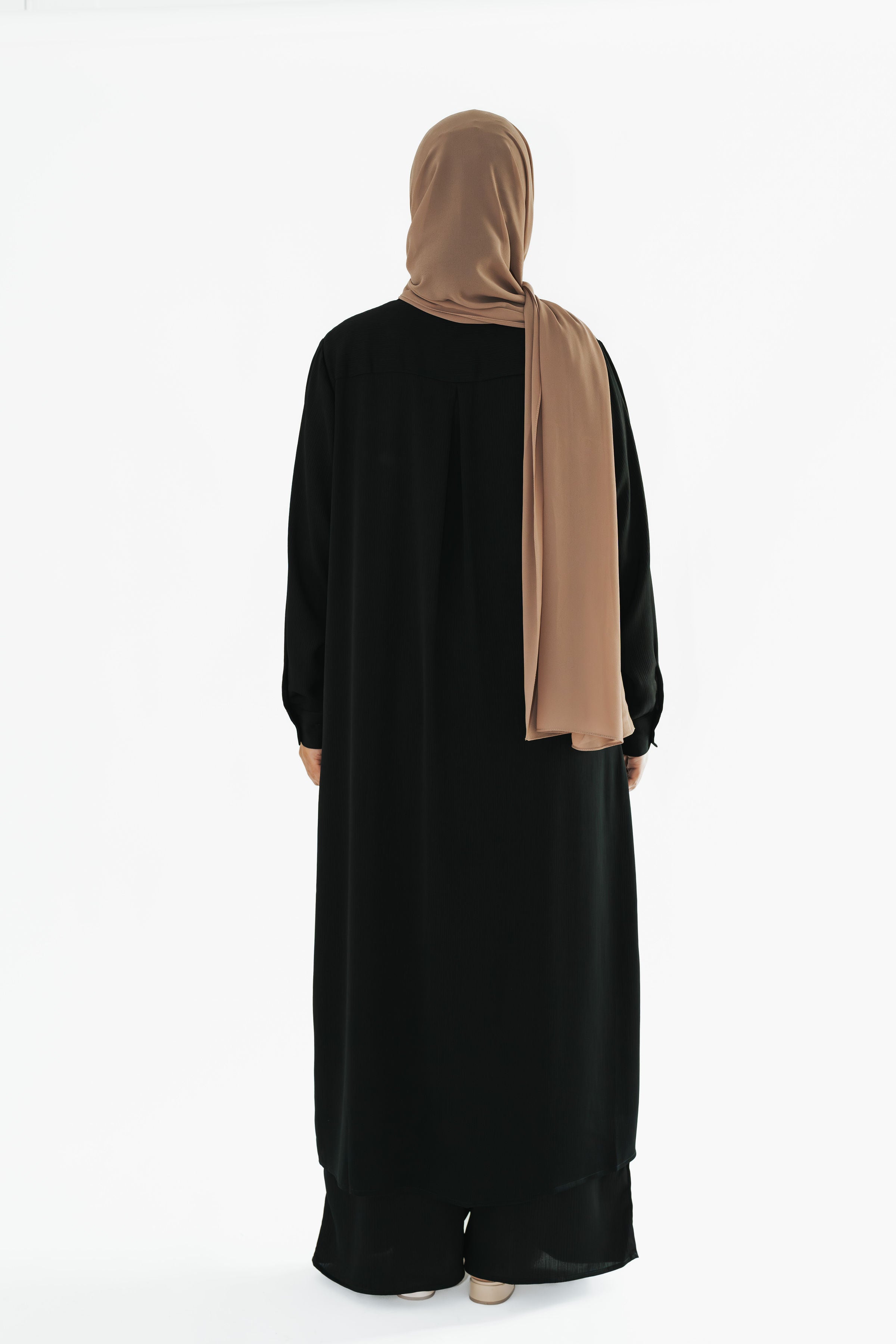 Indulge in timeless elegance with our Black Long Button-Down Tunic. This modest essential exudes sophistication with its long silhouette and button front detail. Perfect for any occasion, it's a must-have for your wardrobe. Elevate your style effortlessly with this exclusive piece. Pair with our Black Loose Pants (sold separately) for a complete look.