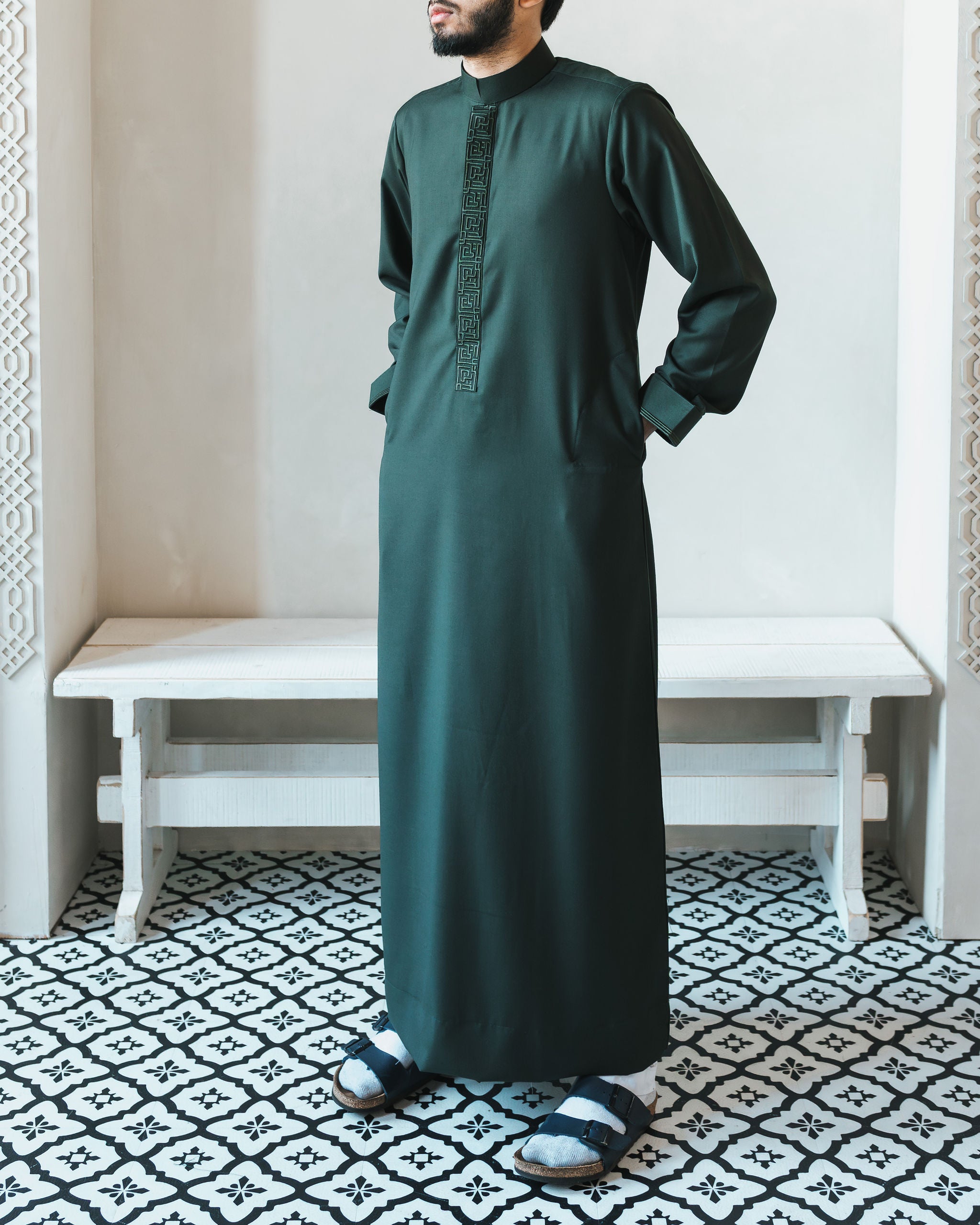 Elevate your wardrobe with our Men's Forest Green Signature Thobe, featuring an elegant twist on traditional style. The aaBideen signature embroidery on the placket adds a unique touch to this must-have piece.