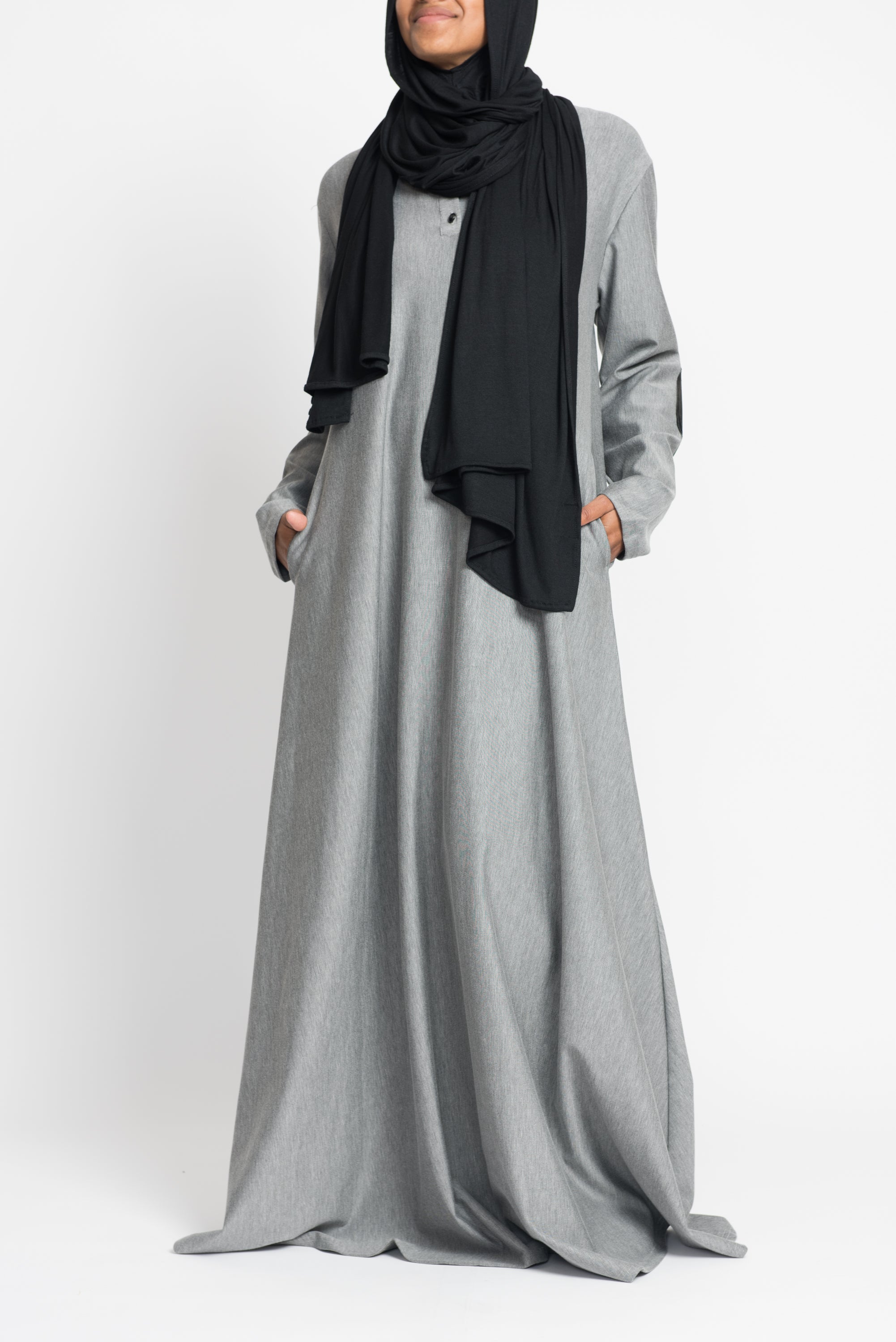 This henley abaya is a simple and comfortable choice with black patches at the elbows. Buttons down the front make it nursing-friendly.