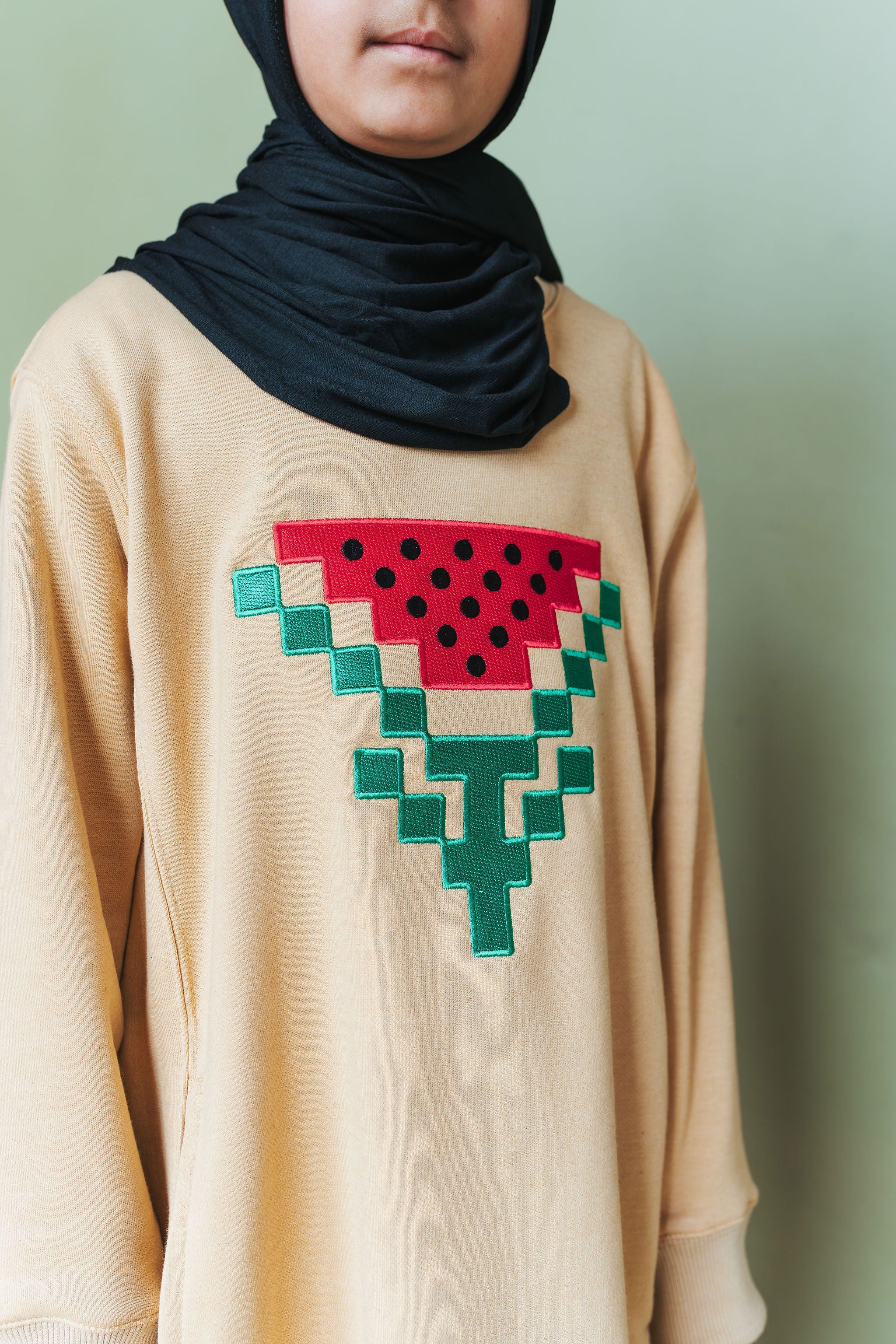 The artwork on this garment was inspired by Mustaali Raj’s design of the watermelon as a symbol of resistance. He incorporated the design in a Tatreez embroidery pattern, paying homage to the preservation of the rich Palestinian heritage. The embroidery itself on this garment is done by machine.