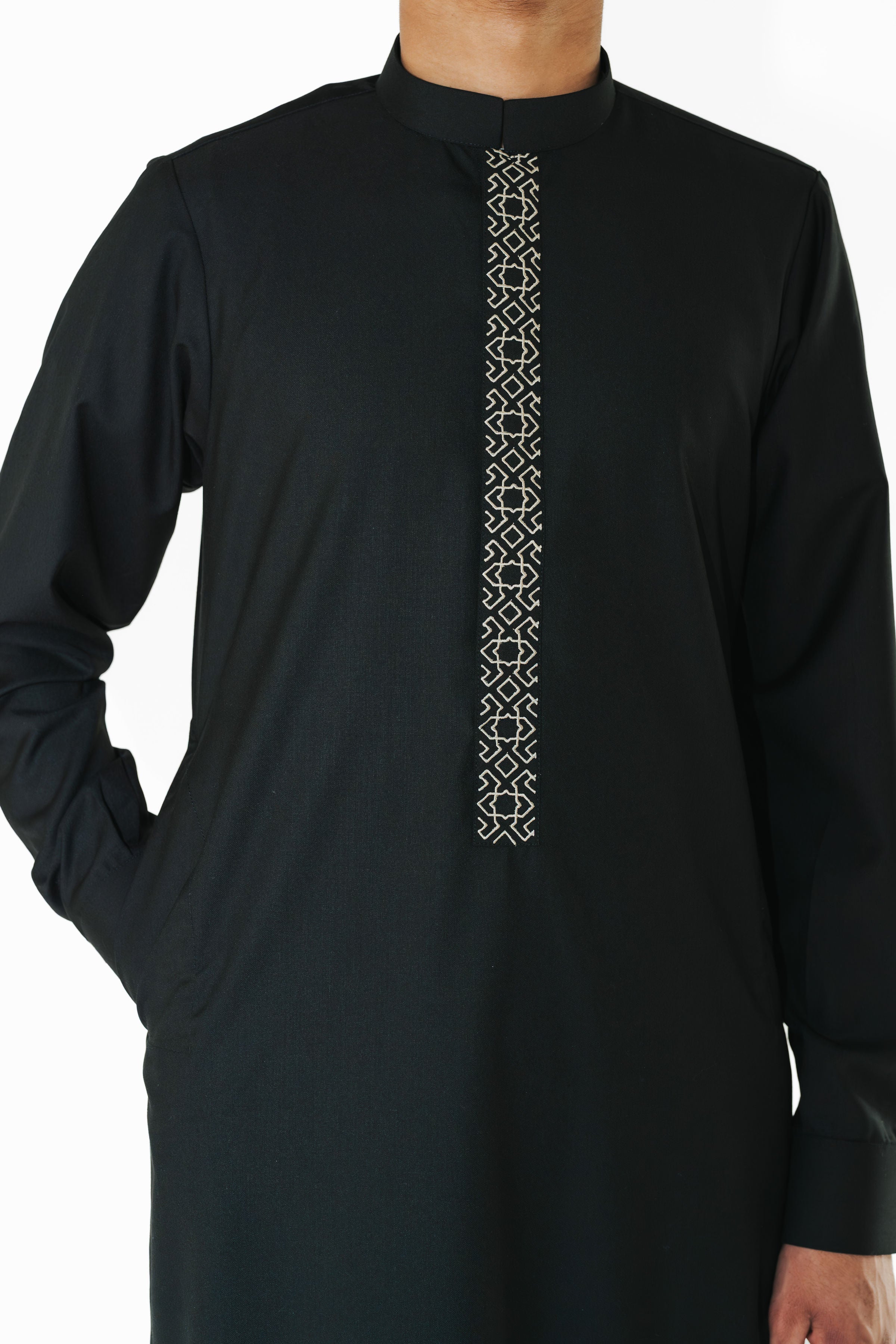 Introducing our Men's Black Geo Embroidered Thobe, featuring sophisticated embroidery on the placket. This black thobe is the perfect choice for a refined and elegant look, offering a touch of traditional embellishment to elevate your style. Exude confidence and sophistication with this exquisite piece.