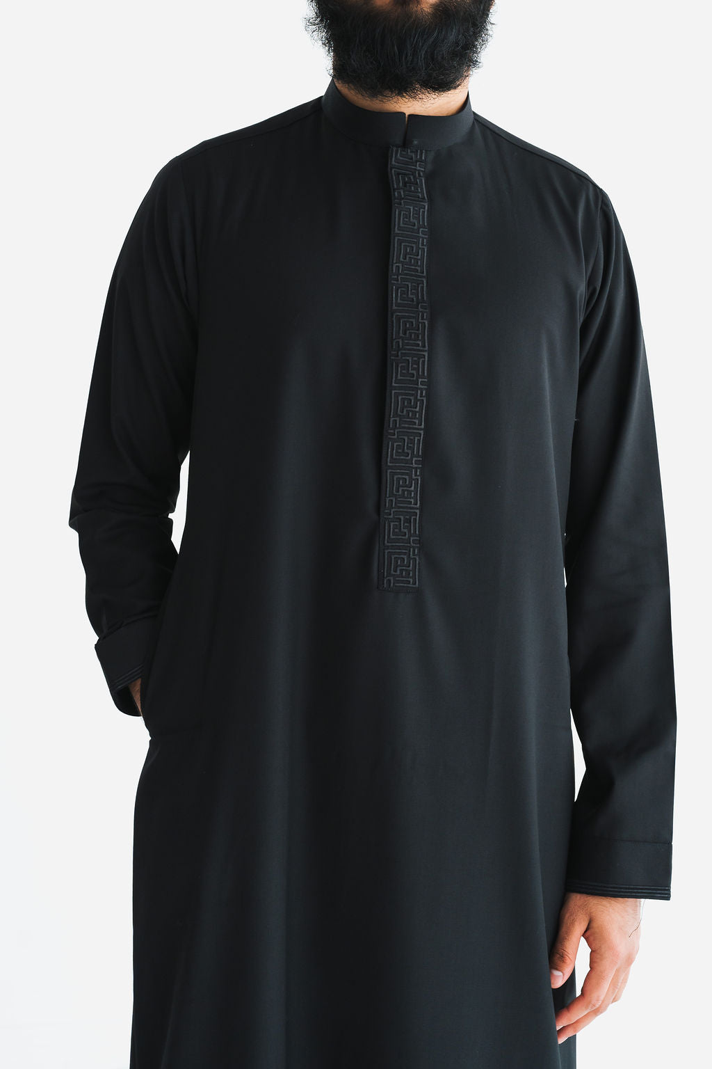 Elevate your wardrobe with our Men's Black Signature Thobe, featuring an elegant twist on traditional style. The aaBideen signature embroidery on the placket adds a unique touch to this must-have piece.