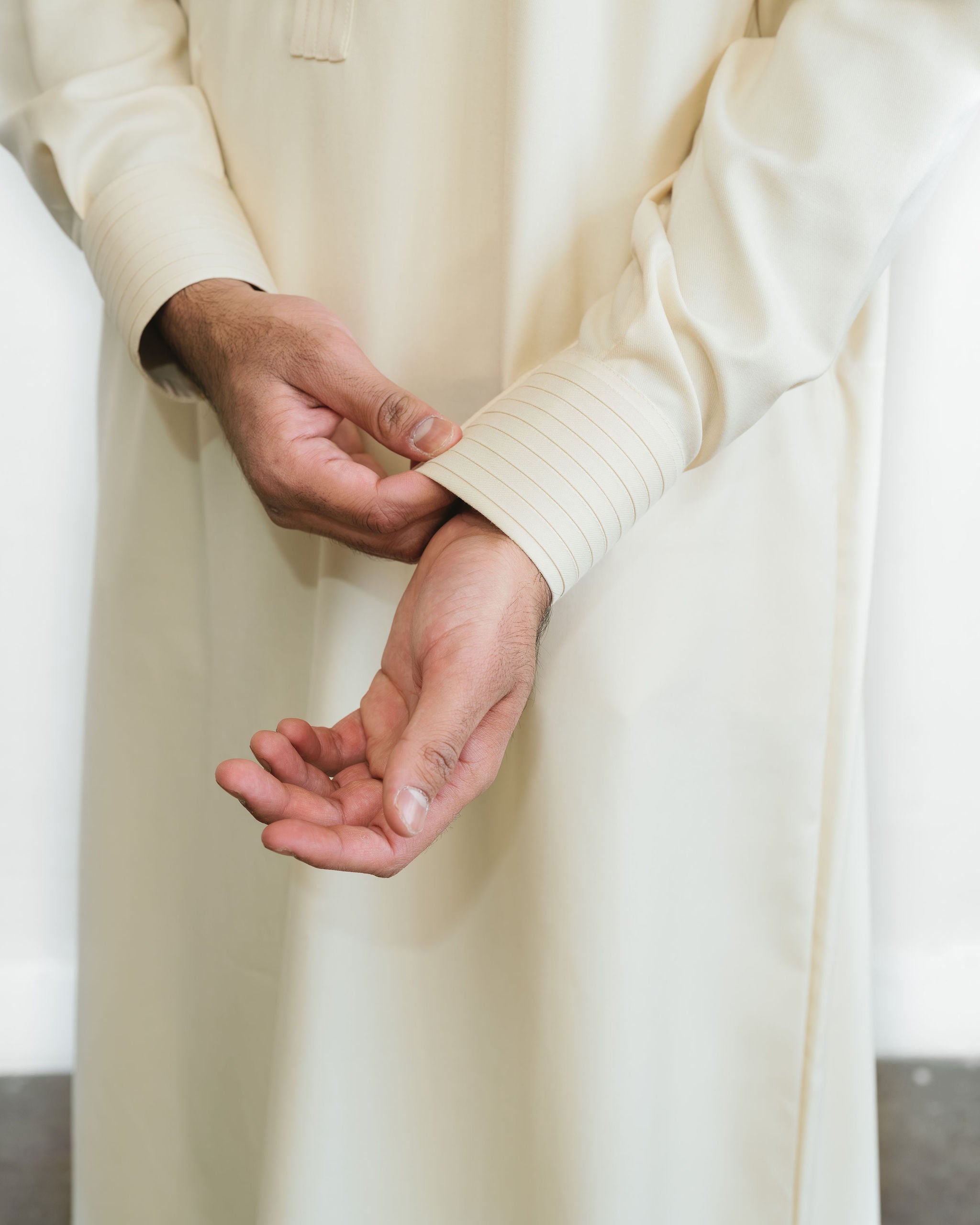 The Men's Ecru Pintuck Placket Thobe combines traditional craftsmanship with refined elegance. Tailored in a soft ecru tone, this thobe features distinctive pintuck detailing along the placket, adding subtle texture and visual interest to the front closure. The relaxed, flowing silhouette provides comfort for all-day wear while maintaining a polished appearance suitable for both casual and formal occasions. Crafted with attention to detail, this versatile piece works seamlessly into any wardrobe seeking timeless sophistication.