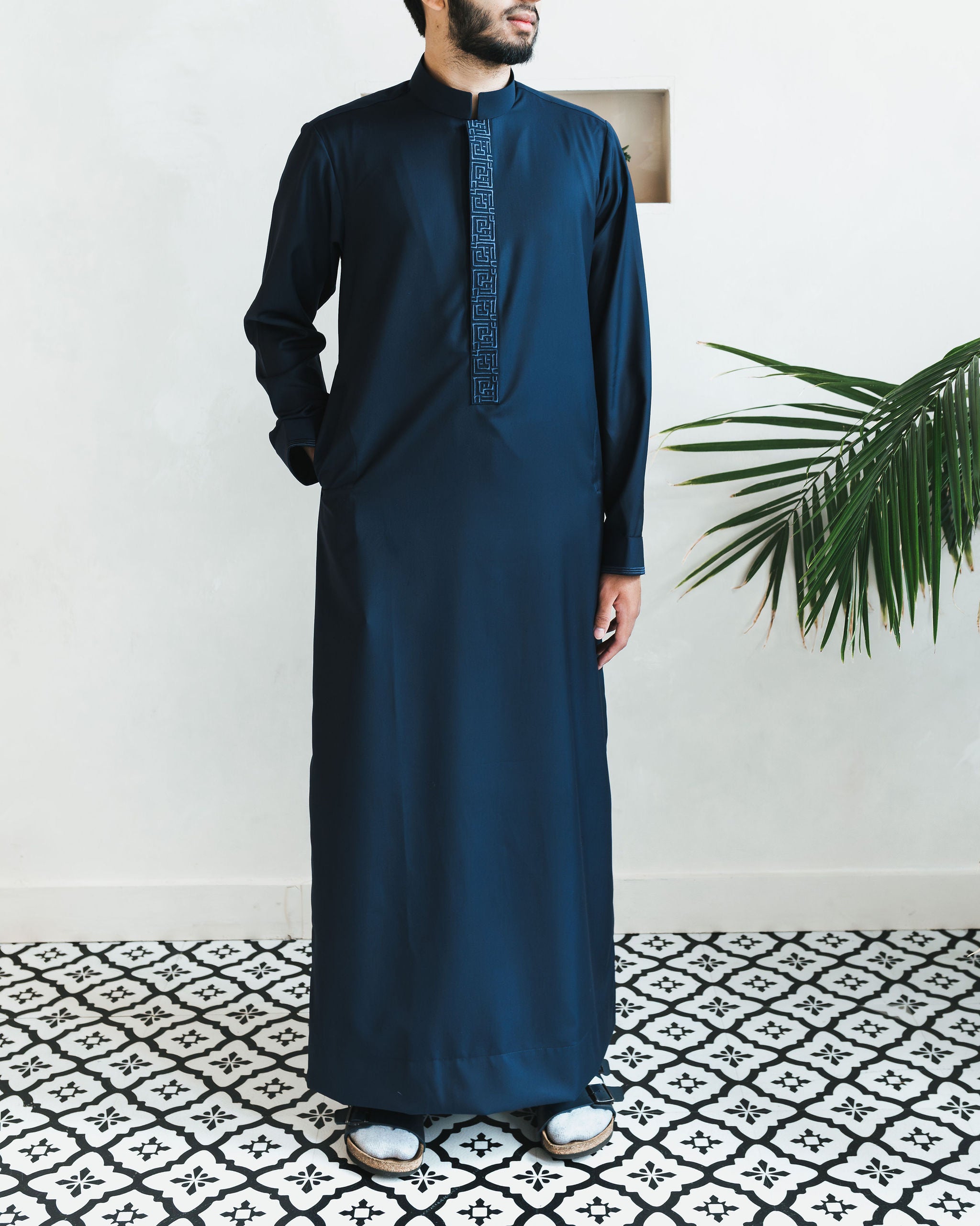 Elevate your wardrobe with our Men's Navy Signature Thobe, featuring an elegant twist on traditional style. The aaBideen signature embroidery on the placket adds a unique touch to this must-have piece.