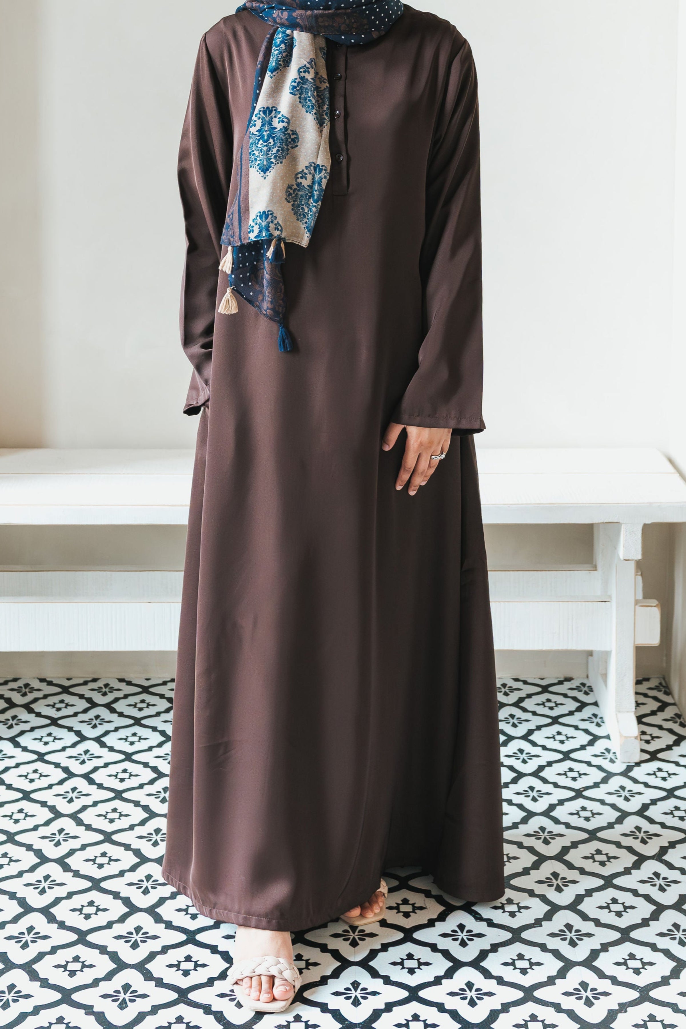 Our Essentials Abaya are your go-to for effortless style. With a simple button front design, this abaya offers a simple and modern look. Perfect to wear on it's own with a plain or printed hijab or, layer it with your favorites. It's an essential addition to your wardrobe.