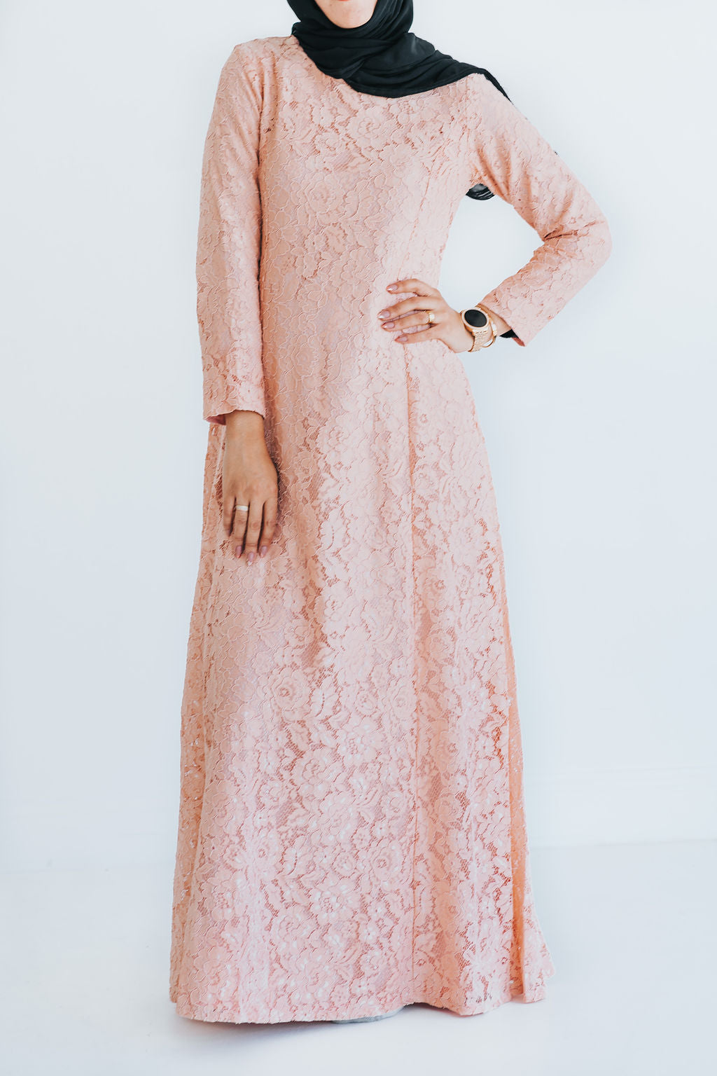 Perfect for special occasions, this lace abaya will elevate your look while covering you modestly. Compliment the beautiful lace with a hijaab color of your choice or pair it with peach for a monochrome look.