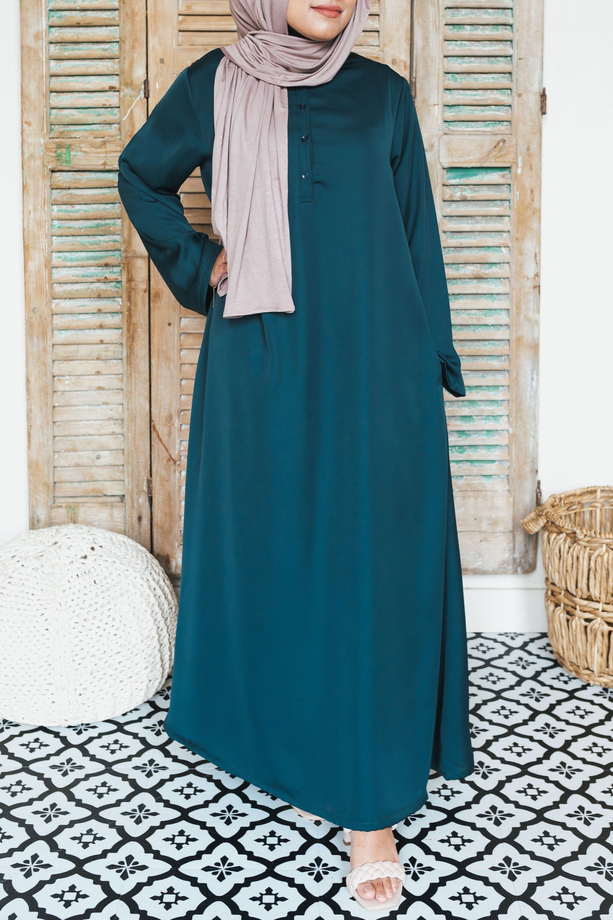 Our Essentials Abaya are your go-to for effortless style. With a simple button front design, this abaya offers a simple and modern look. Perfect to wear on it's own with a plain or printed hijab or, layer it with your favorites. It's an essential addition to your wardrobe.
