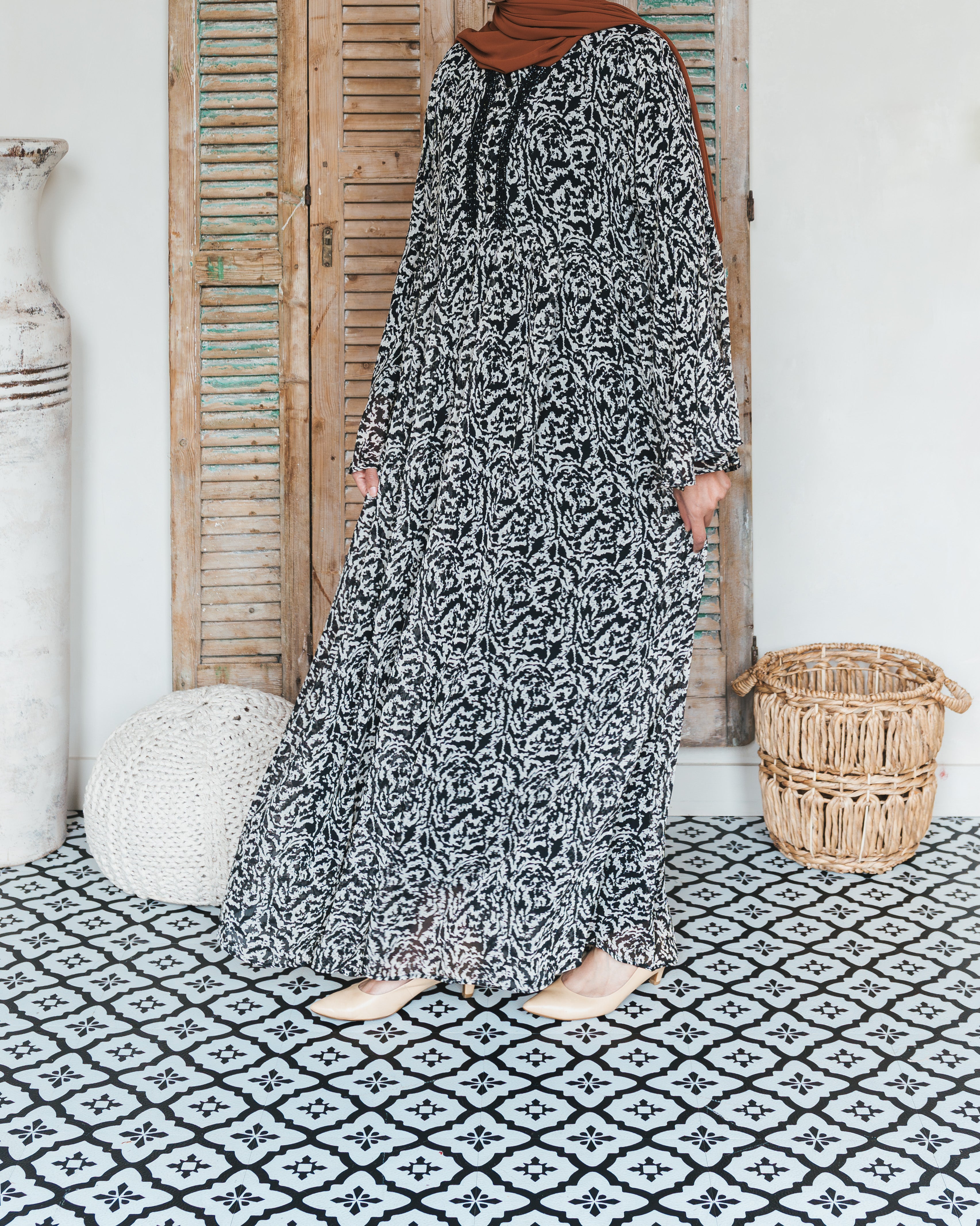 Our sheer abayas are the perfect lightweight layering pieces. Add the Sheer Black and White Lace Abaya over a long full sleeve slip and you're ready. Its sheer fabric is easy to wear and the dainty lace on the bodice adds a touch of elegance while keeping you cool and comfortable. Also perfect for traveling as it's light weight and requires minimal ironing. Look effortlessly chic in this must-have piece.