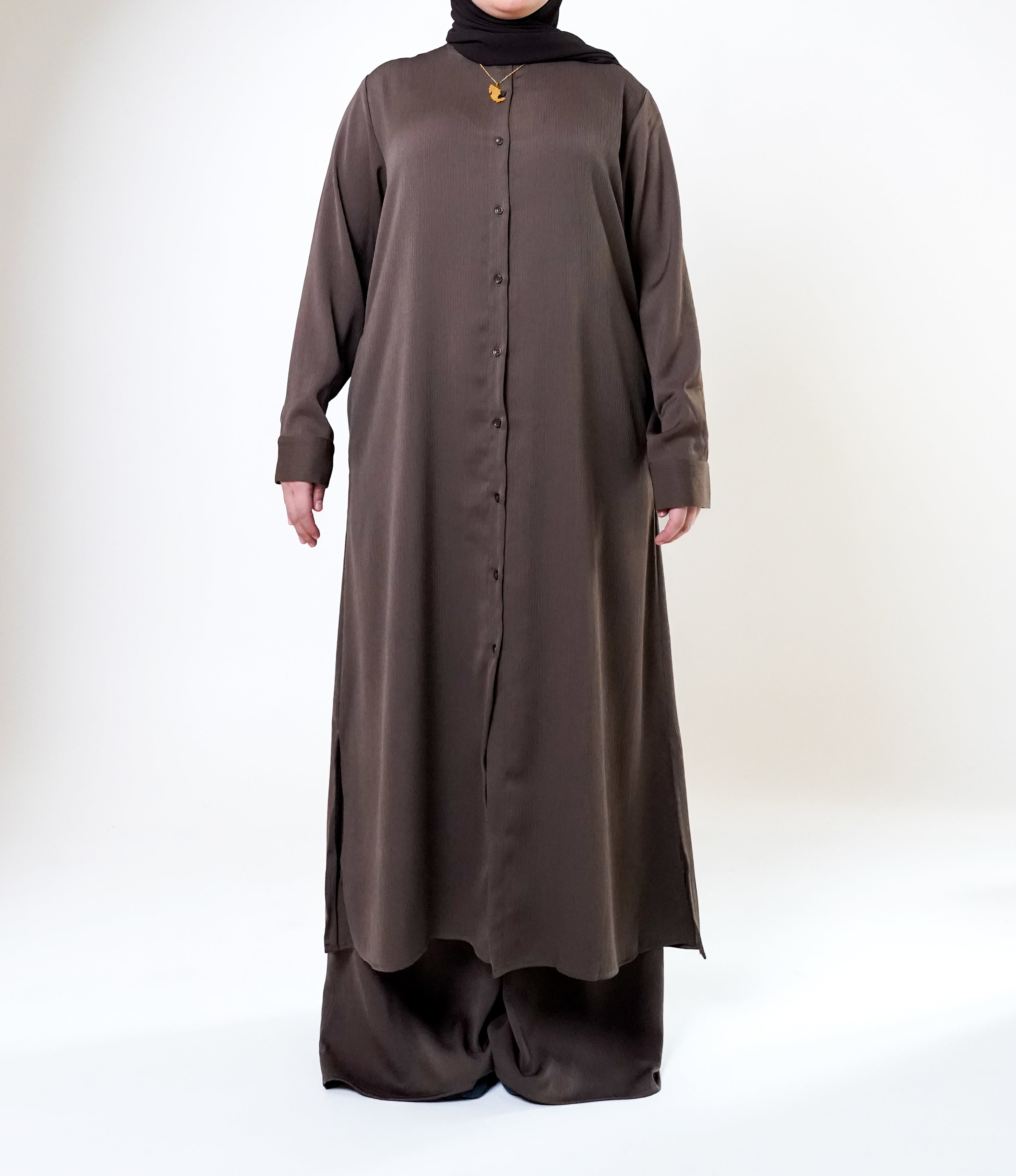 Indulge in timeless elegance with our Taupe Long Button-Down Tunic. This modest essential exudes sophistication with its long silhouette and button front detail. Perfect for any occasion, it's a must-have for your wardrobe. Elevate your style effortlessly with this exclusive piece. Pair with our Taupe Loose Pants (sold separately) for a complete look.